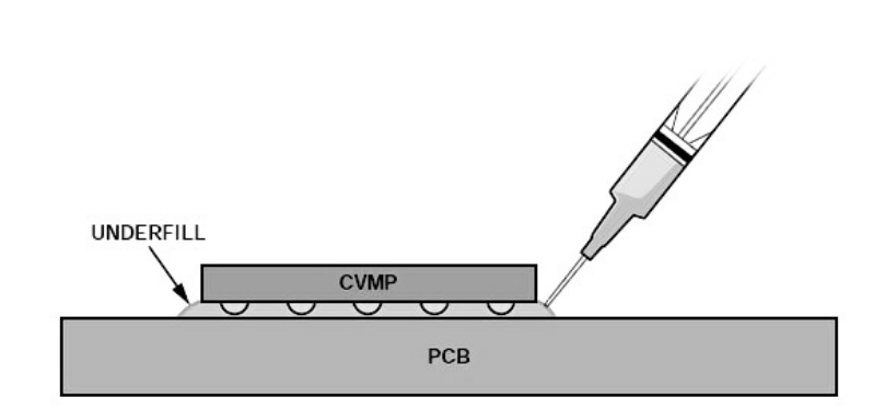 底部填充膠簡(jiǎn)單來(lái)說(shuō)就是底部填充之義,常規(guī)定義是一種用化學(xué)膠水(主要成份是環(huán)氧樹(shù)脂)對(duì)BGA 封裝模式的芯片進(jìn)行底部填充,利用加熱的固化形式,將BGA 底部空隙大面積 (一般覆蓋一般覆80%以上)填滿,從而達(dá)到加固的目的,增強(qiáng)BGA 封裝模式的芯片和PCBA 之間的抗跌落性能。底部填充膠還有一些非常規(guī)用法,是利用一些瞬干膠或常溫固化形式膠水在BGA 封裝模式芯片的四周或者部分角落部分填滿,從而達(dá)到加固目的。