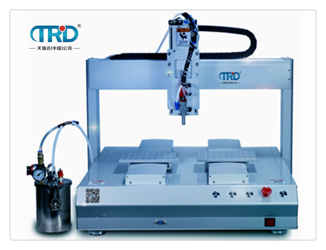 TB-4331VF三軸雙平臺自動點膠機可對各種工件進行自動點膠作業。解決了人工重復性點膠動作出現的點膠不均勻等現象。并可以提升效率,節省人力。可替代人工特定的點膠作業,實現機械化生產。自動點膠機操作簡單,生產效率高、點膠質量好、環保又節能、初學者也能達到熟練工人的點膠效果。本機采用簡易快速地輸入點膠程序,其軟件并具有強大的編輯功能,可輕易、快速的完成程序教導。